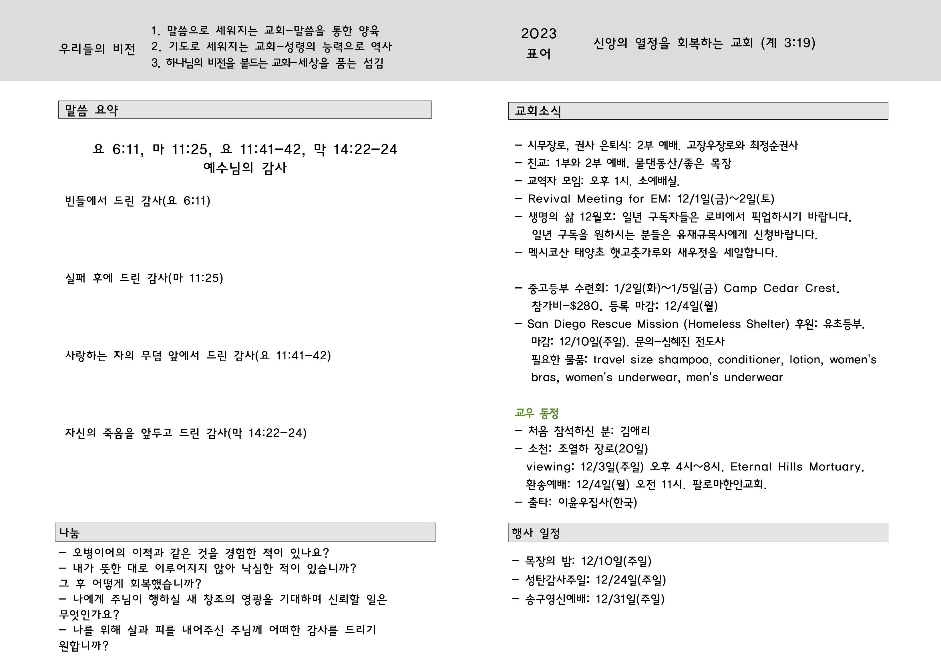 교회소식 . 23년 11월 26일 주일 Author JungS. Date 2023-11-25 21:08 Views 727 Like 0 Unlike 0 Print List Prev Next Powered by KBoard