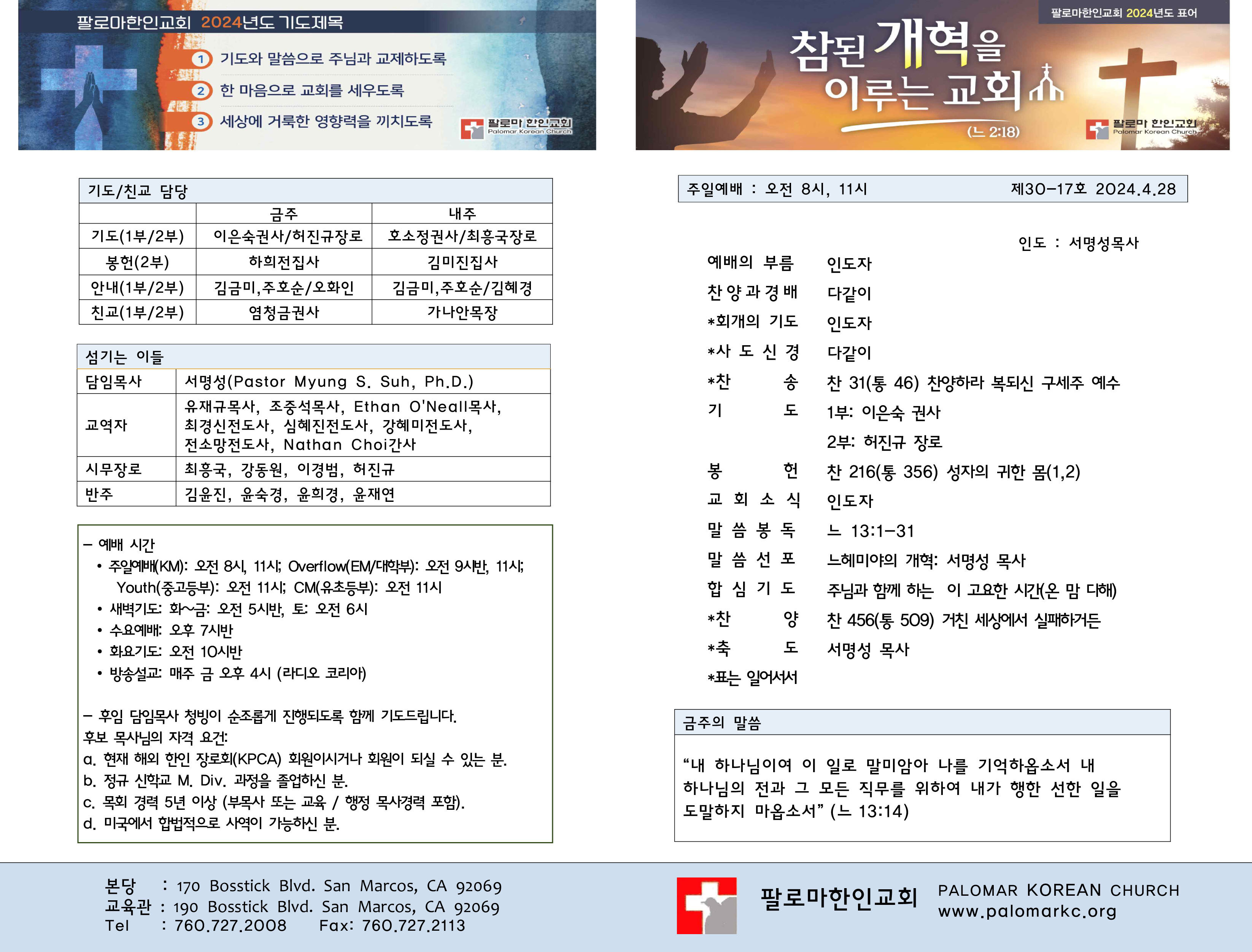 교회소식 . 24년 4월 28일 주일 Author JungS. Date 2024-04-27 20:55 Views 728 Like 0 Unlike 0 Print List Prev Next Powered by KBoard