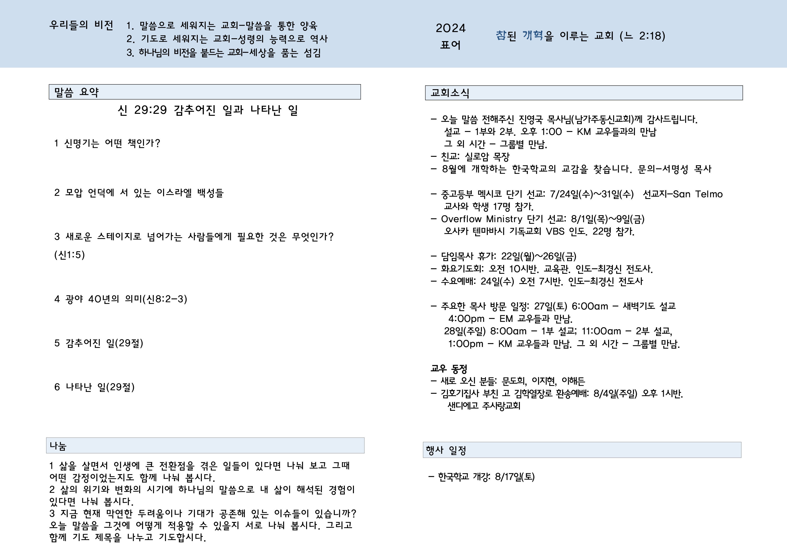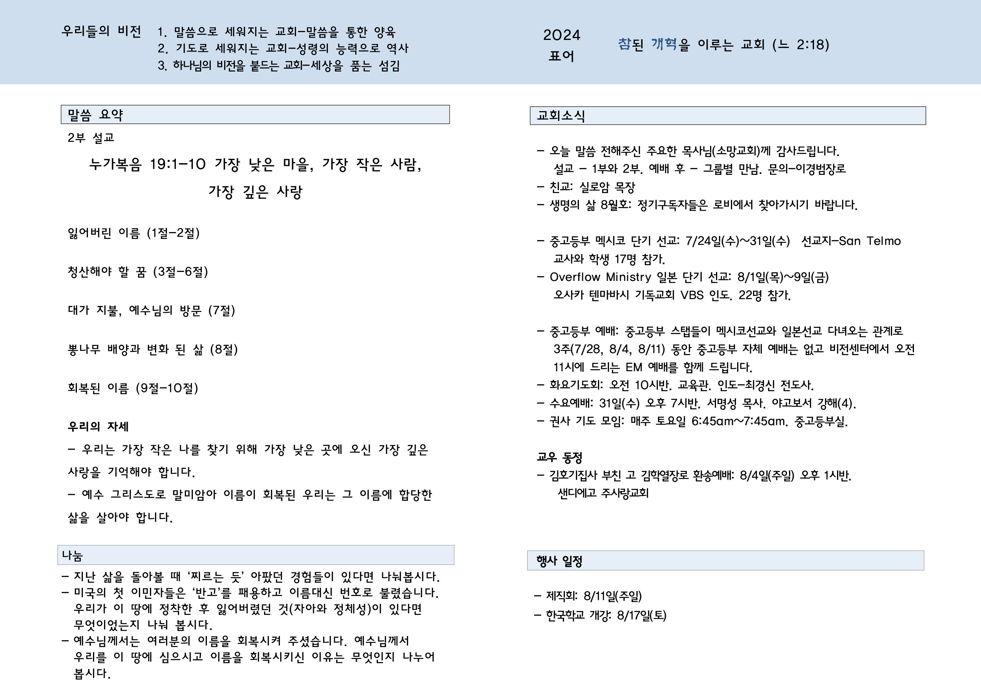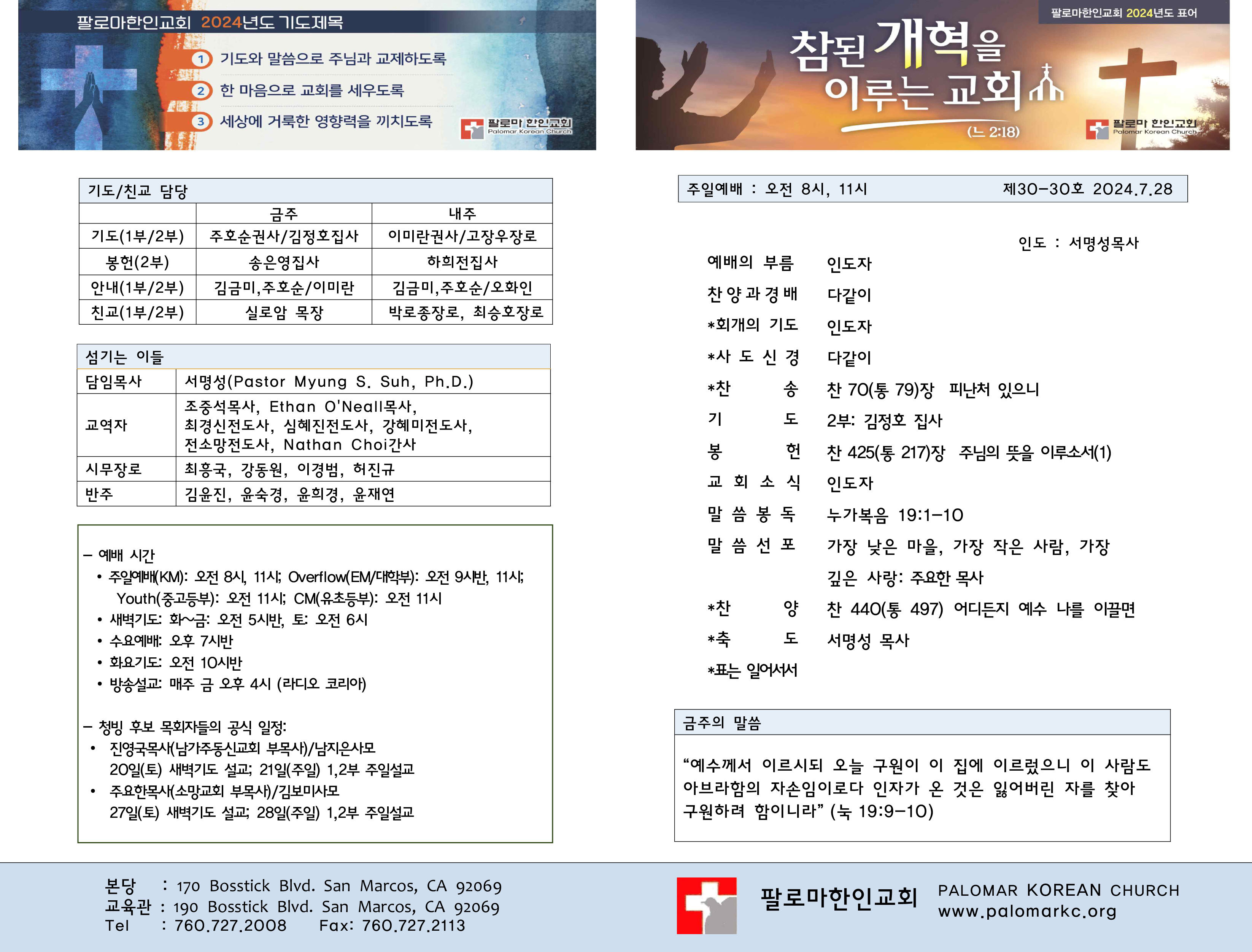 교회소식 . 24년 7월 28일 주일 Author JungS. Date 2024-07-27 23:19 Views 663 Like 0 Unlike 0 Print List Prev Next Powered by KBoard