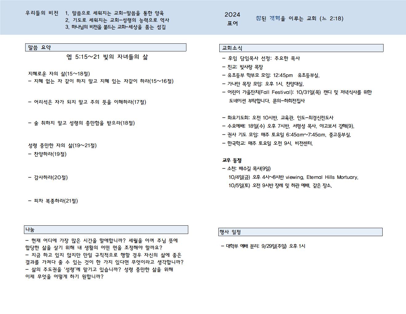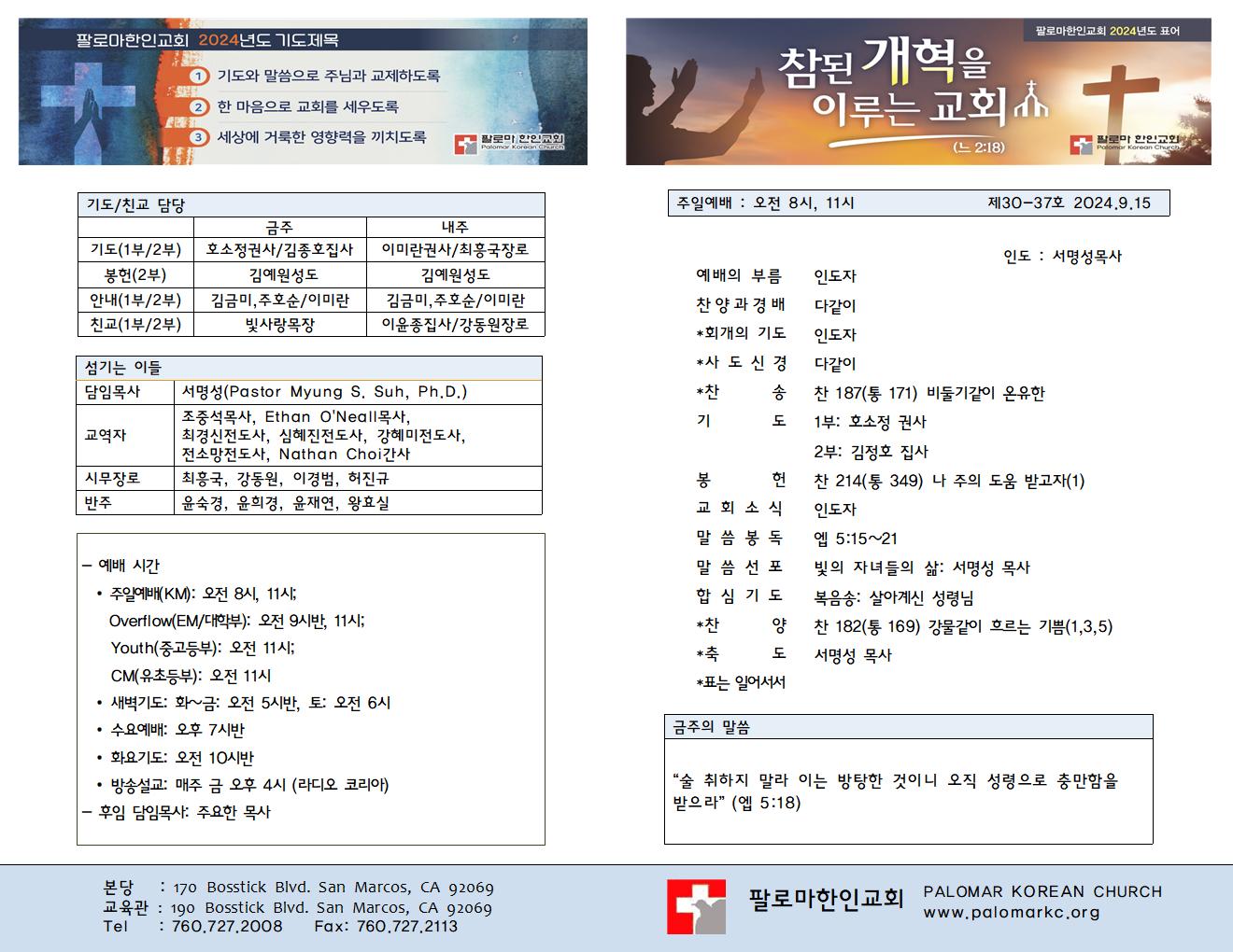 교회소식 . 24년 9월 15일 주일 Author JungS. Date 2024-09-21 19:35 Views 452 Like 0 Unlike 0 Print List Prev Next Powered by KBoard