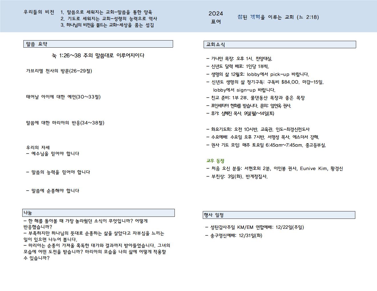 교회소식 . 24년 12월 8일 주일 Author JungS. Date 2024-12-07 21:38 Views 416 Like 0 Unlike 0 Print List Prev Next Powered by KBoard